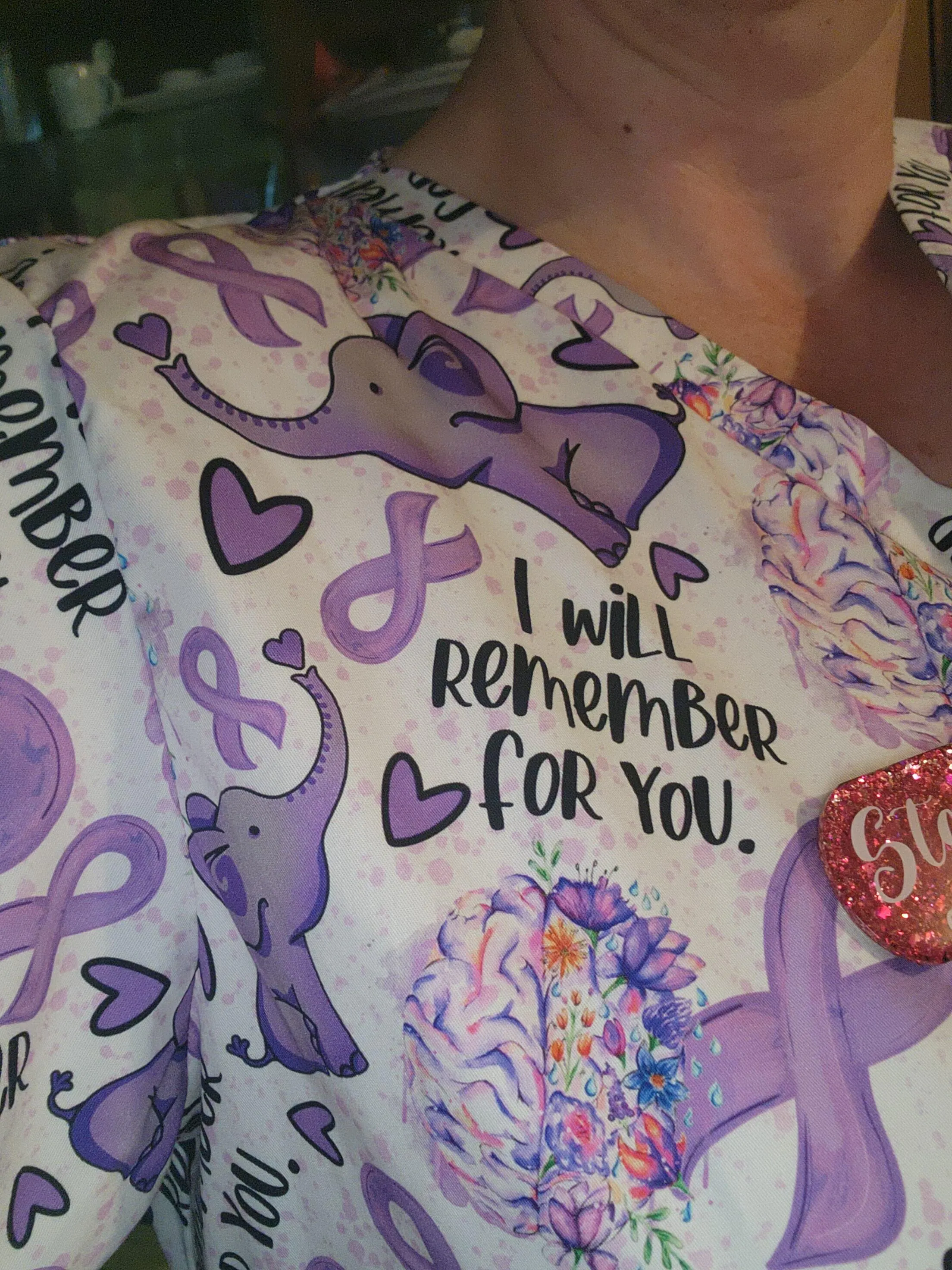 The Dementia Awareness Scrub is designed for awareness. This cotton scrub features "I will remember for you" printed on the front and a ribbon in purple and sweet elephant. Support the cause and feel great with the Dementia Awareness Scrub.